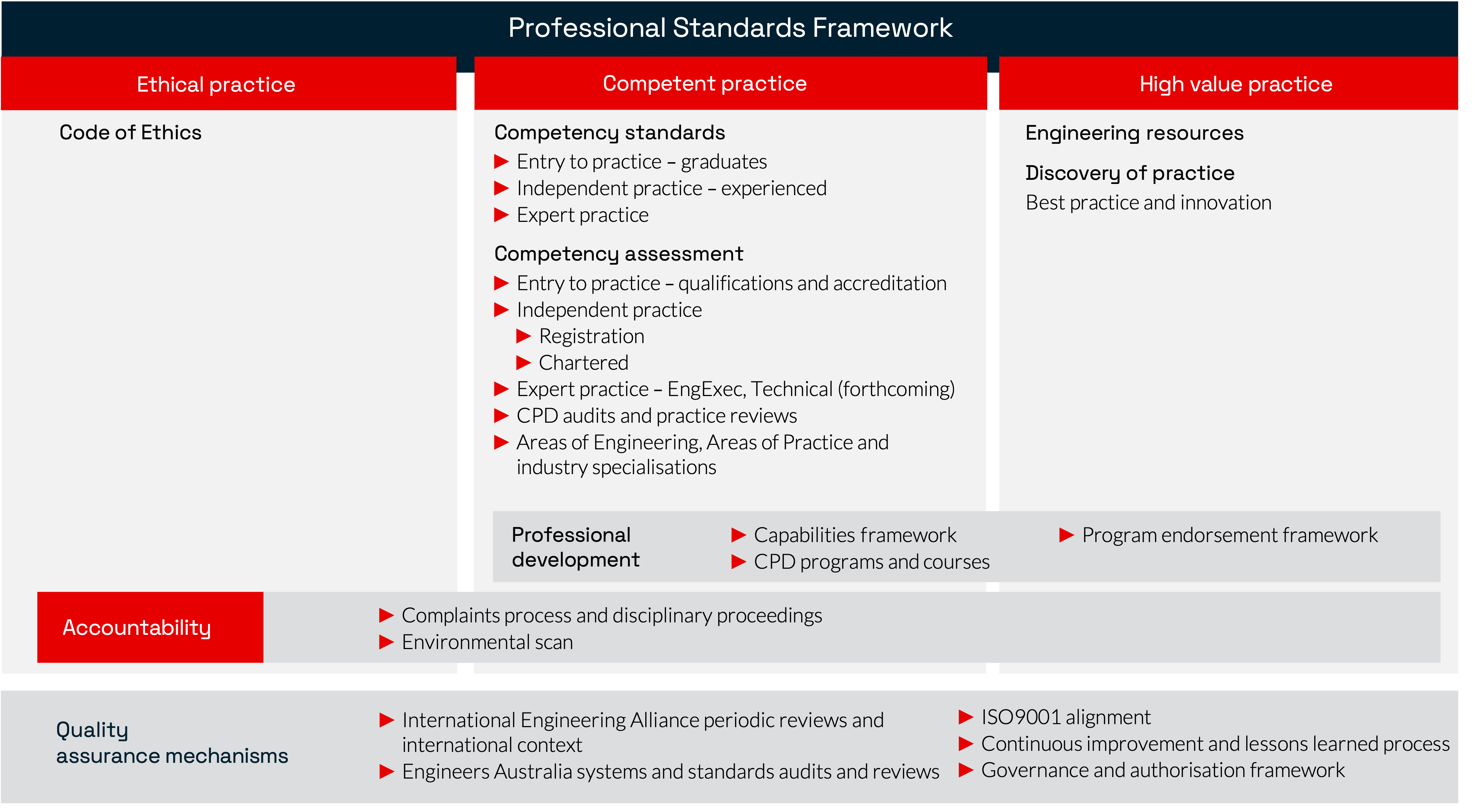 The framework includes engineering practice guides and other resources related to professional knowledge, practice and engagement. This includes the Engineers Australia Capability Framework, Program Endorsement Framework and the Professional Performance, Innovation and Risk Protocol.